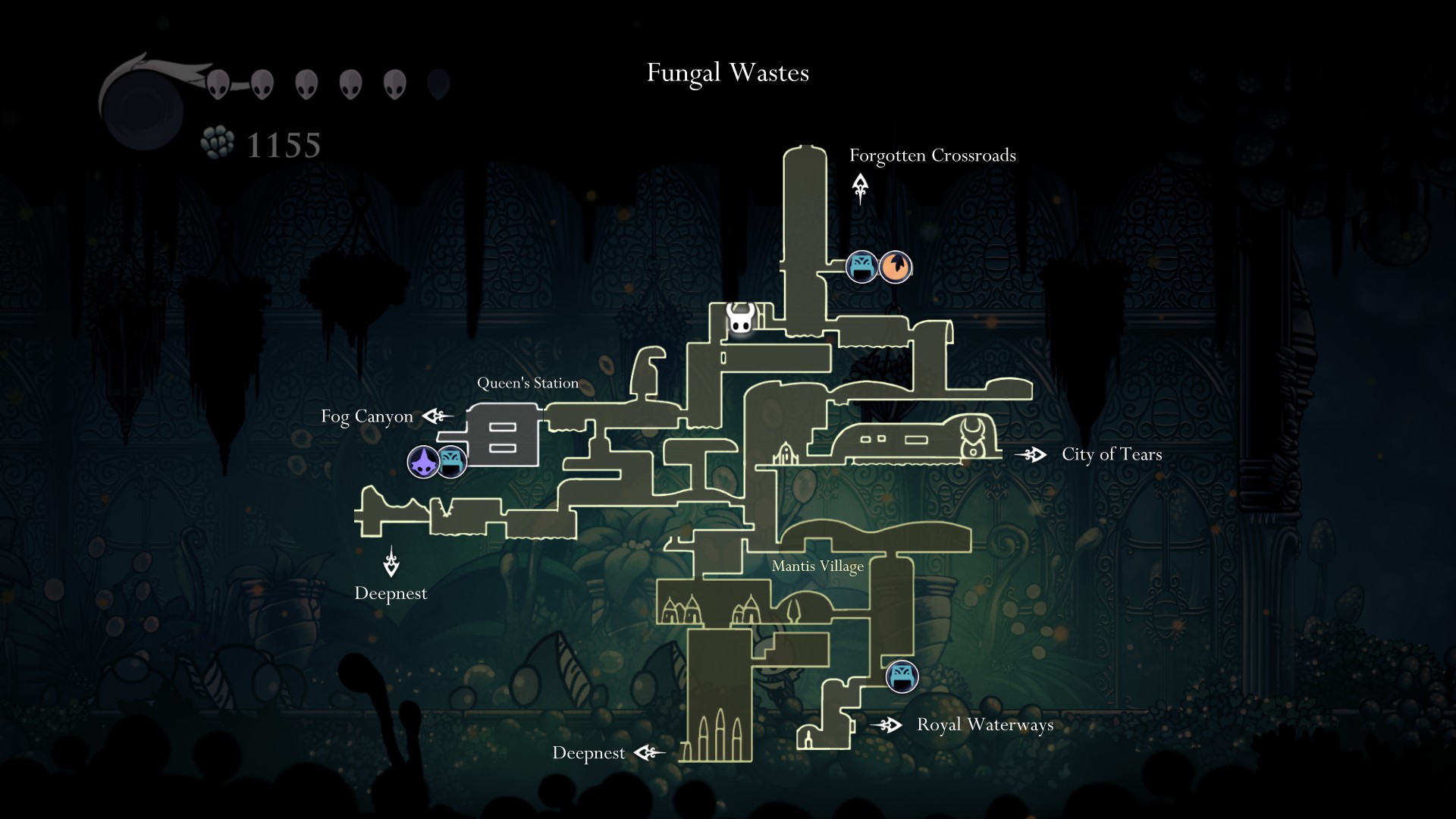 Hollow knight is a 2d adventure metroidvania game for pc mac linux nintendo switch playstation 4 and xbox one. Fan hollow knight content. For this walkthrough i ll assume you re coming from the lower side of the fungal wastes at the very bottom of the map. Fog canyon is a small foggy area situated between greenpath and the fungal wastes.